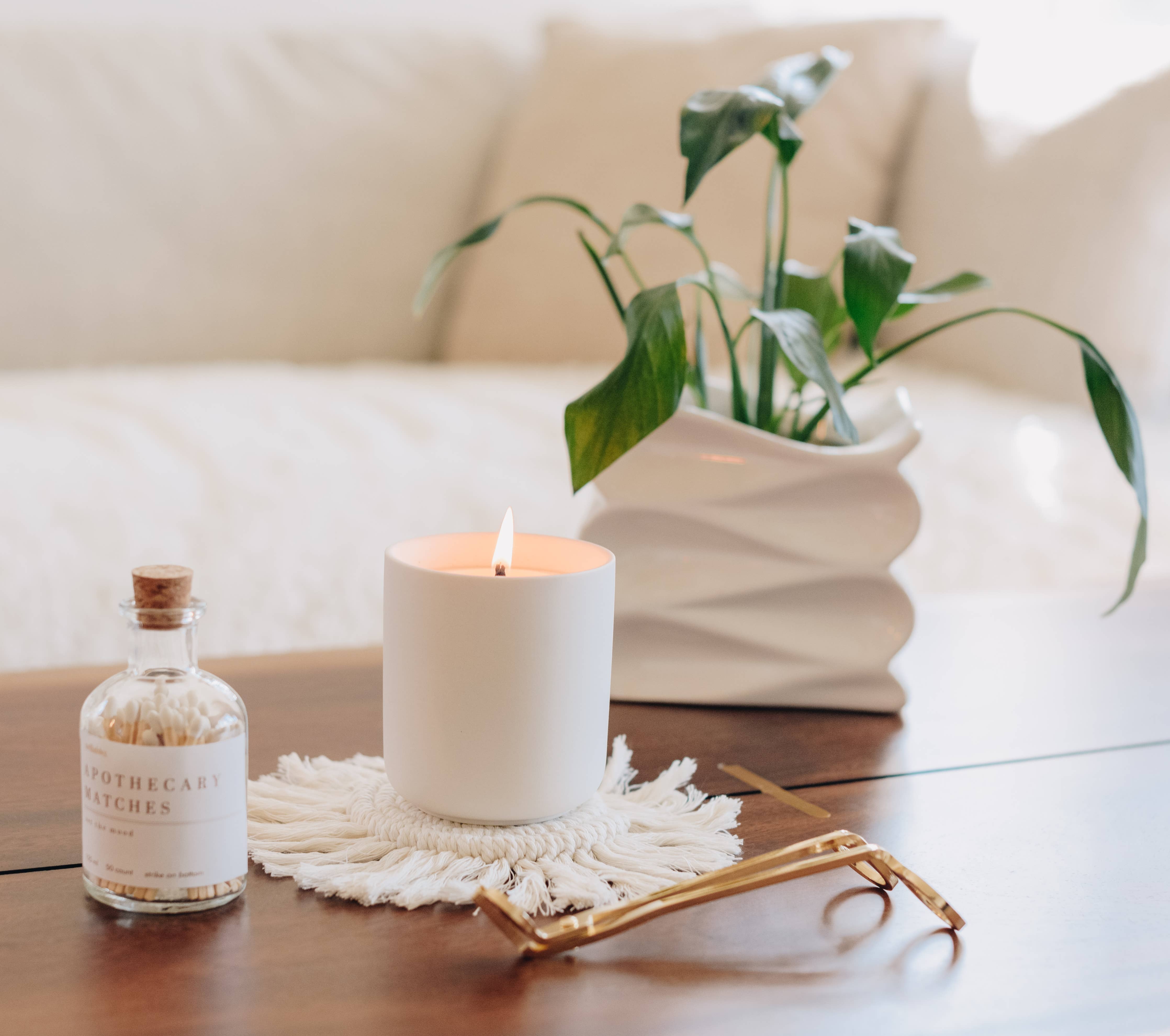 Cream-colored woven macrame with fringe detail. This fun coaster will add a bohemian touch to your decor. Set candles on it to protect your table from the heat and show them off with the attention they deserve!