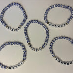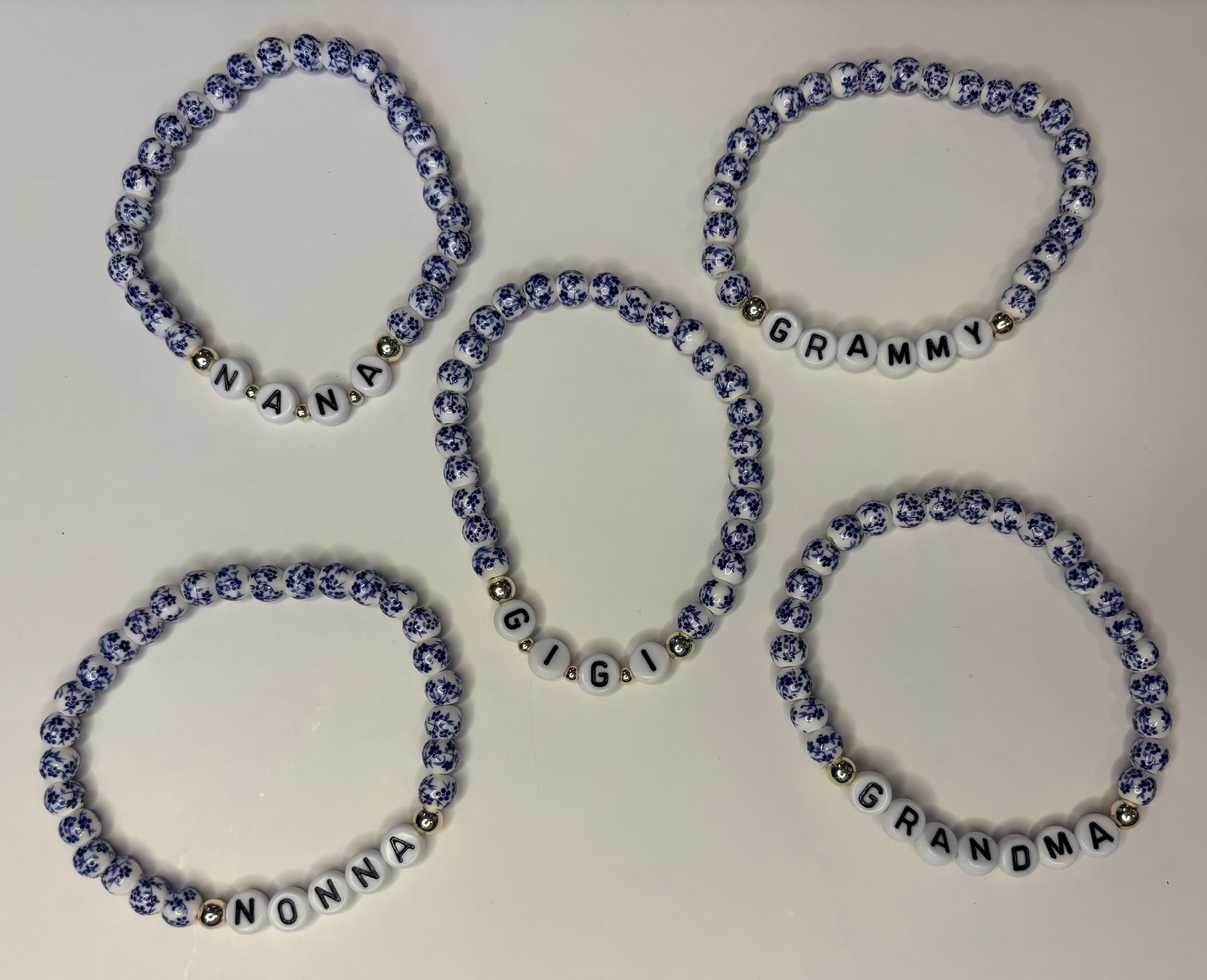 These handmade name bracelets are the perfect gift choice for showing your gratitude to grandma. Stunning blue ceramic floral beads accented by gold plated beads surround your choice of word. Hand strung on durable stretch cord, sized at approximately 7 inches. Pairs perfectly with our floral stacking bracelets. Handmade at the Jersey shore by a small, woman owned and operated business. Our packaging is minimal and eco friendly. We give back a portion of sales to marine conservation charities. Thank you for your support!