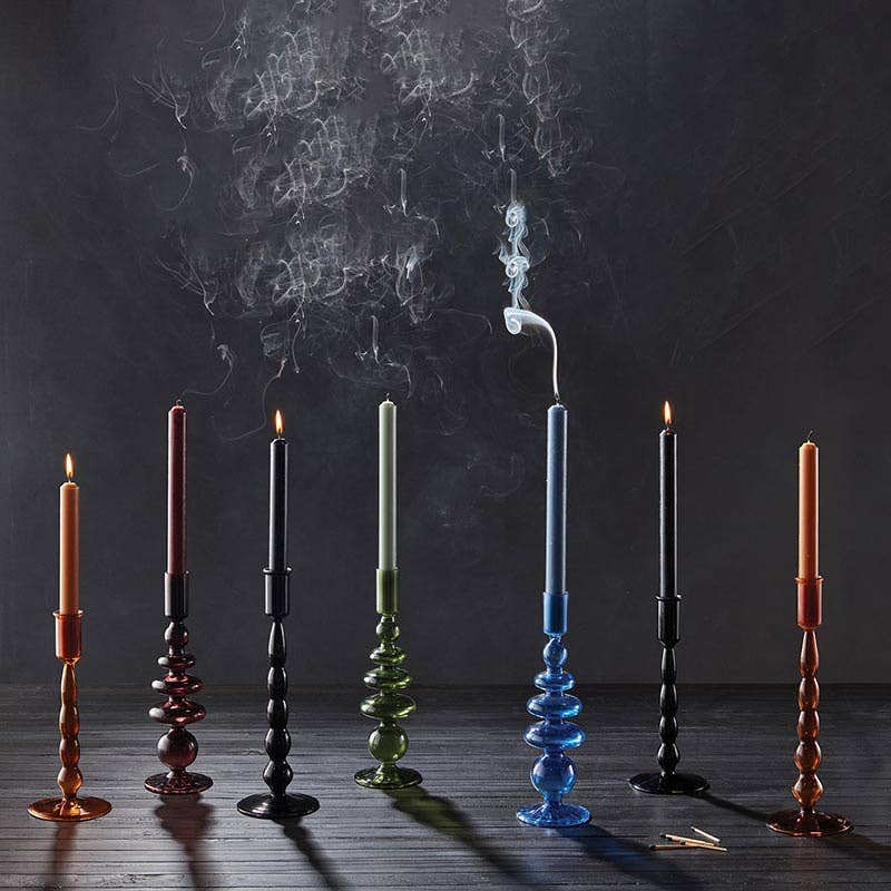 This unique, abstract, glass candleholder is perfect for holding a taper candle or small flowers. • Material: Glass • Size: 3.5"Dia x 9"H • Care Instructions: Spot Clean Only