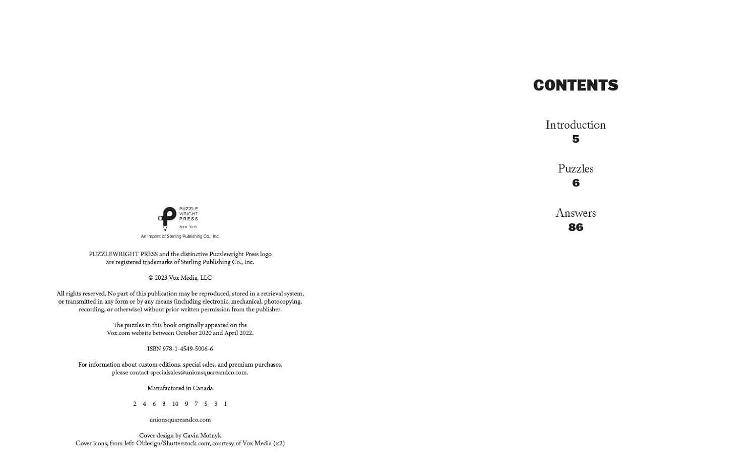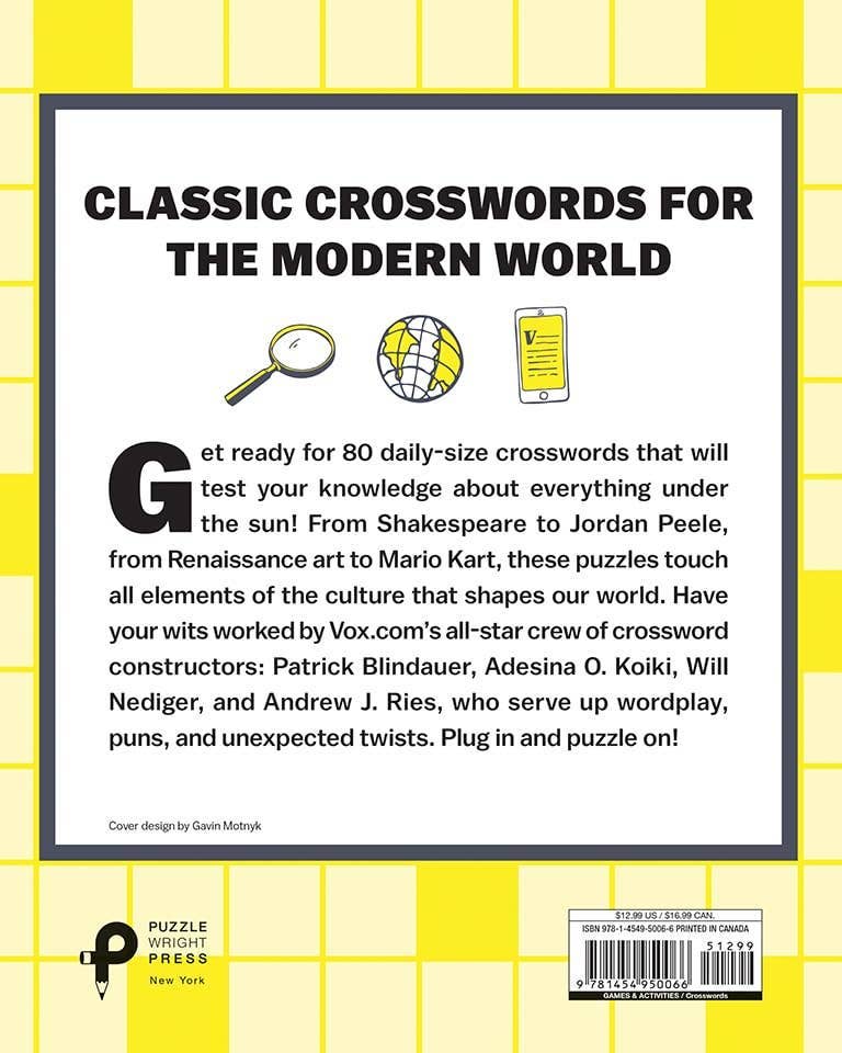 This book includes 72 themed, 15x15 crosswords, some easy, some tricky, by Vox.com's all-star crew of crossword constructors: Patrick Blindauer, Adesina Koiki, Will Nediger, and Andrew J. Ries. The puzzles feature classic crossword themes, with wordplay, puns, and unexpected twists peppered throughout. Pop culture references range from Mario Kart to iCarly, from Master P to Bernie Sanders. Trade Paperback Book; 8 x 10 inches; 112 pages.