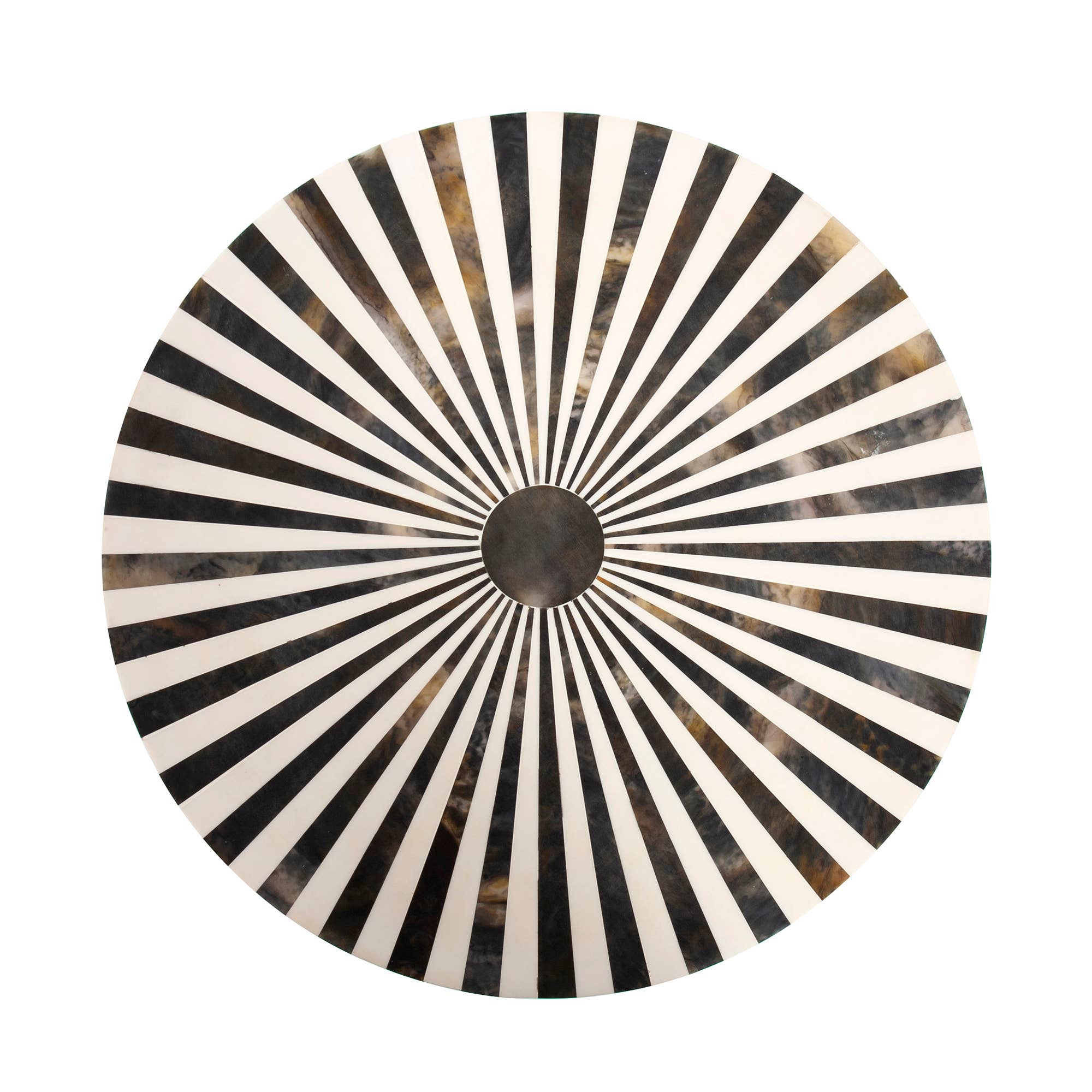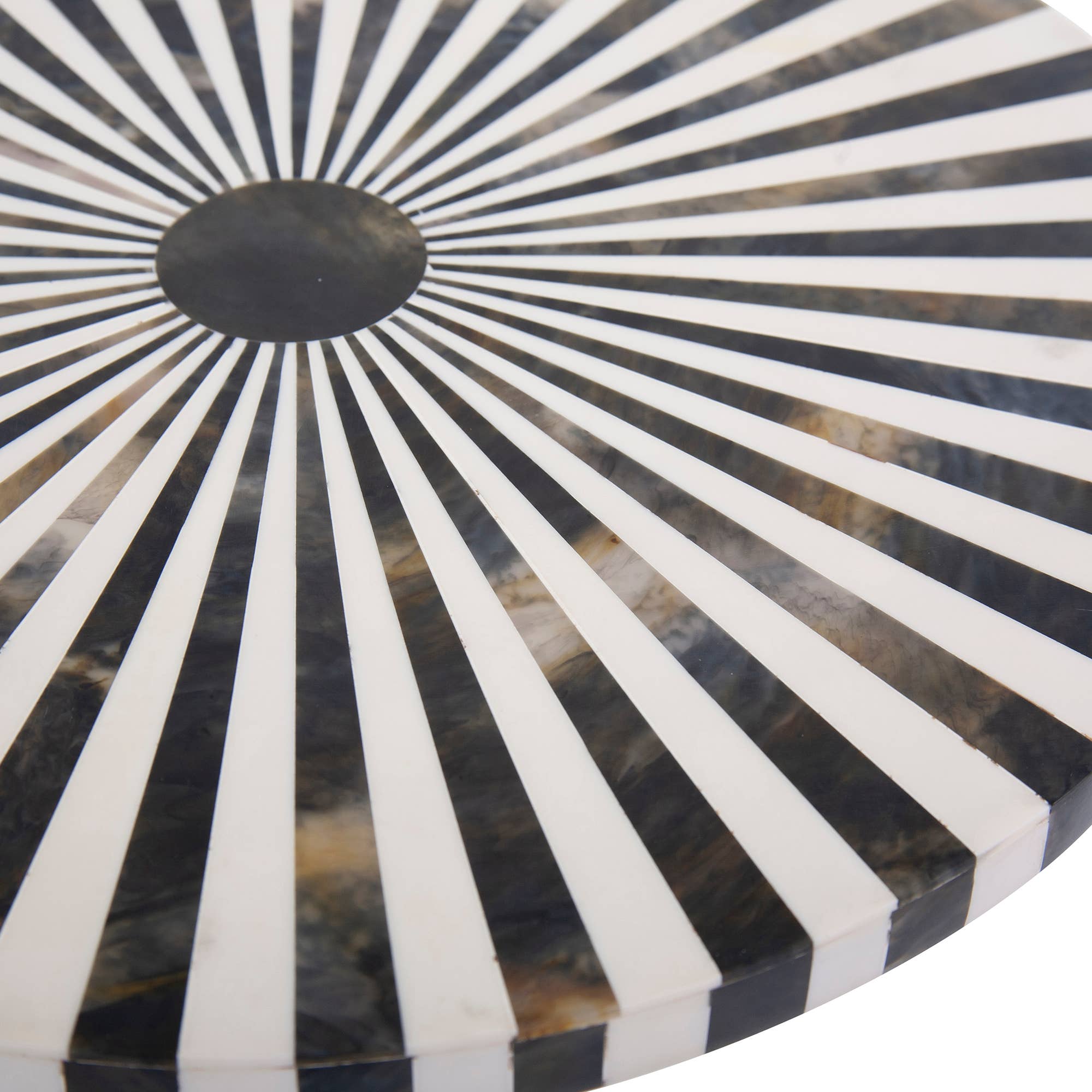 The Aluminum base is finished in antique brass and topped by a round brown and white bone inlay top. Its small footprint makes it the perfect table for small spaces