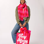 Measures L 24.5" x W 8.5" x H 15.75"; Strap 11"Made from polyester and sequins, Spread holiday cheer with the "Very Merry" Gifting Tote, a bold and festive carryall that’s perfect for gifting, shopping, or hauling holiday goodies. Featuring vivid pink and red stripes with a sequin-accented “Very Merry” design, this oversized tote brings the joy of the season wherever it goes. Sturdy double shoulder straps and a snap closure keep your contents secure while you’re out and about. Whether you’re wrapping up a holiday haul or delivering presents in style, this bag is here to sleigh.
