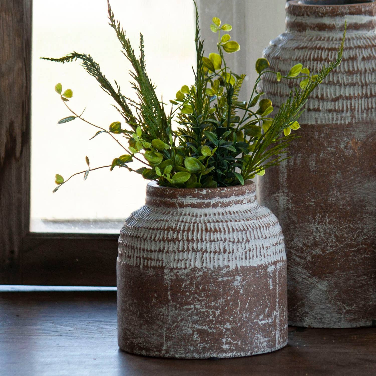 Create a rustic boho aesthetic with the distressed look of our Brio Terracotta collection. Simple shapes are hand molded with terracotta into vases and planters, available in multiple sizes. Carved details add texture along with the distressed white matte glaze.