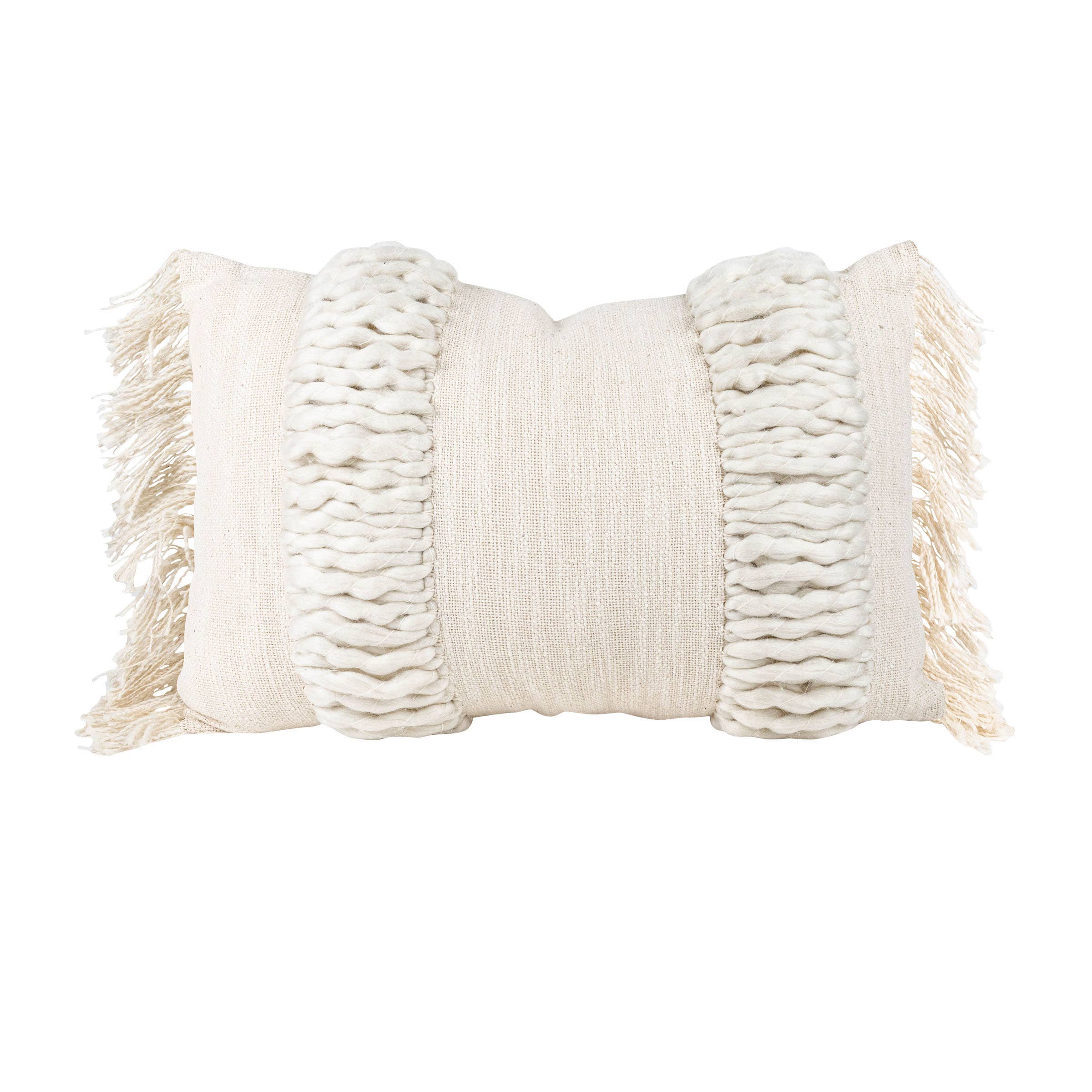 A soft, casual, neutral addition to your pillow selection. Hand woven by artisans in India, this pillow boasts thick acrylic yarns that are attached to the pillow face by hand in two bold, yet subtle stripes. The beautiful, fringe edges make this pillow the perfect cozy addition to your sofa, bench, or bed.