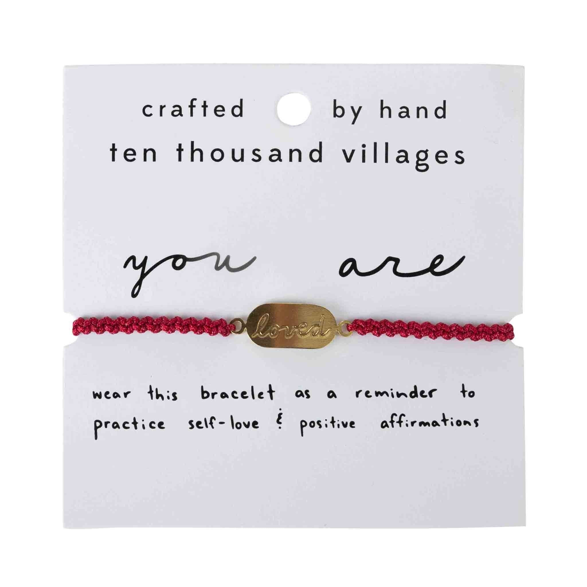 Wrap yourself in love with our Affirmation Bracelet - You Are Loved. Handcrafted in Nepal, this macrame bracelet has an adjustable closure. The inscription "loved" is the perfect reminder of your unique importance and an excellent gift for yourself or someone you love. Nepal Knotcraft Centre provides opportunities and employment for women in under-resourced areas in Nepal.  Materials: Brass, nylon - Measures: 10"L - Colors: Red - Notes: Adjustable -Barcode: 732919545289 -Handcrafted in Nepal