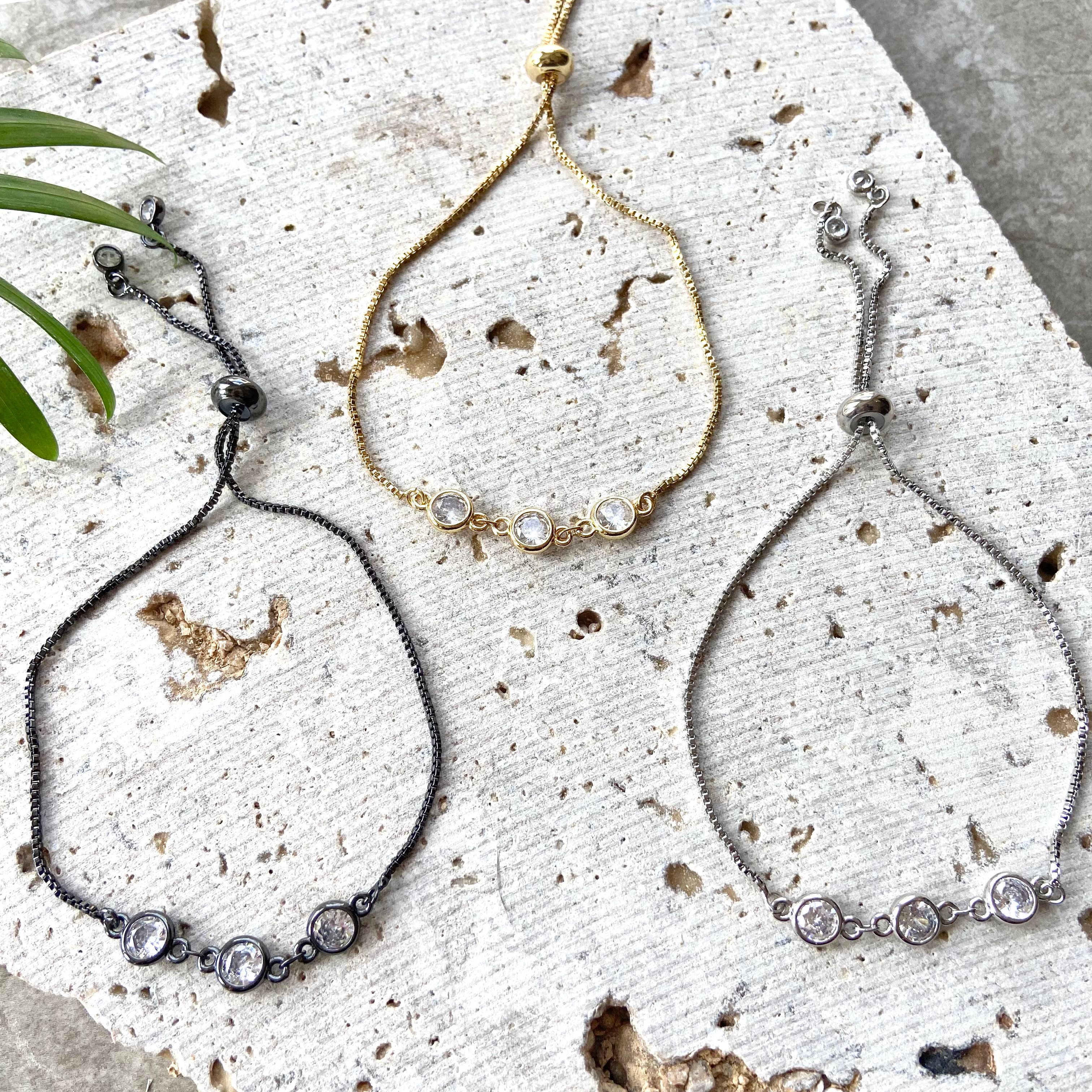 3 round CZ slider bracelet one size fits all. Choose your color. Gold silver or black