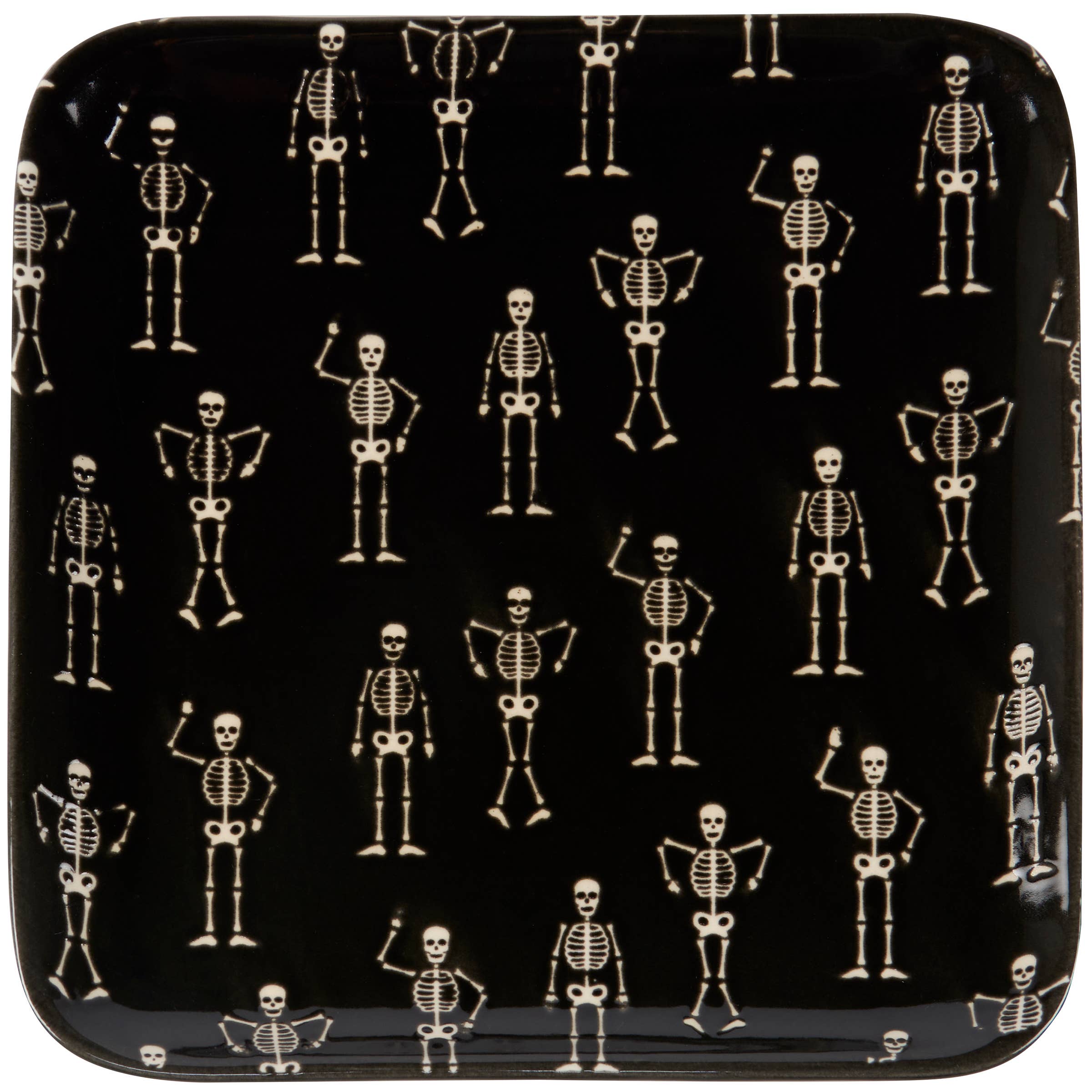A durable stoneware tray from our Halloween Collection displaying a glossy black color with debossed skeleton designs on the inside. Our Skeletons tray is microwave, dishwasher, and food safe for convenient use. A piece of fun tableware perfect for seasonal gatherings.