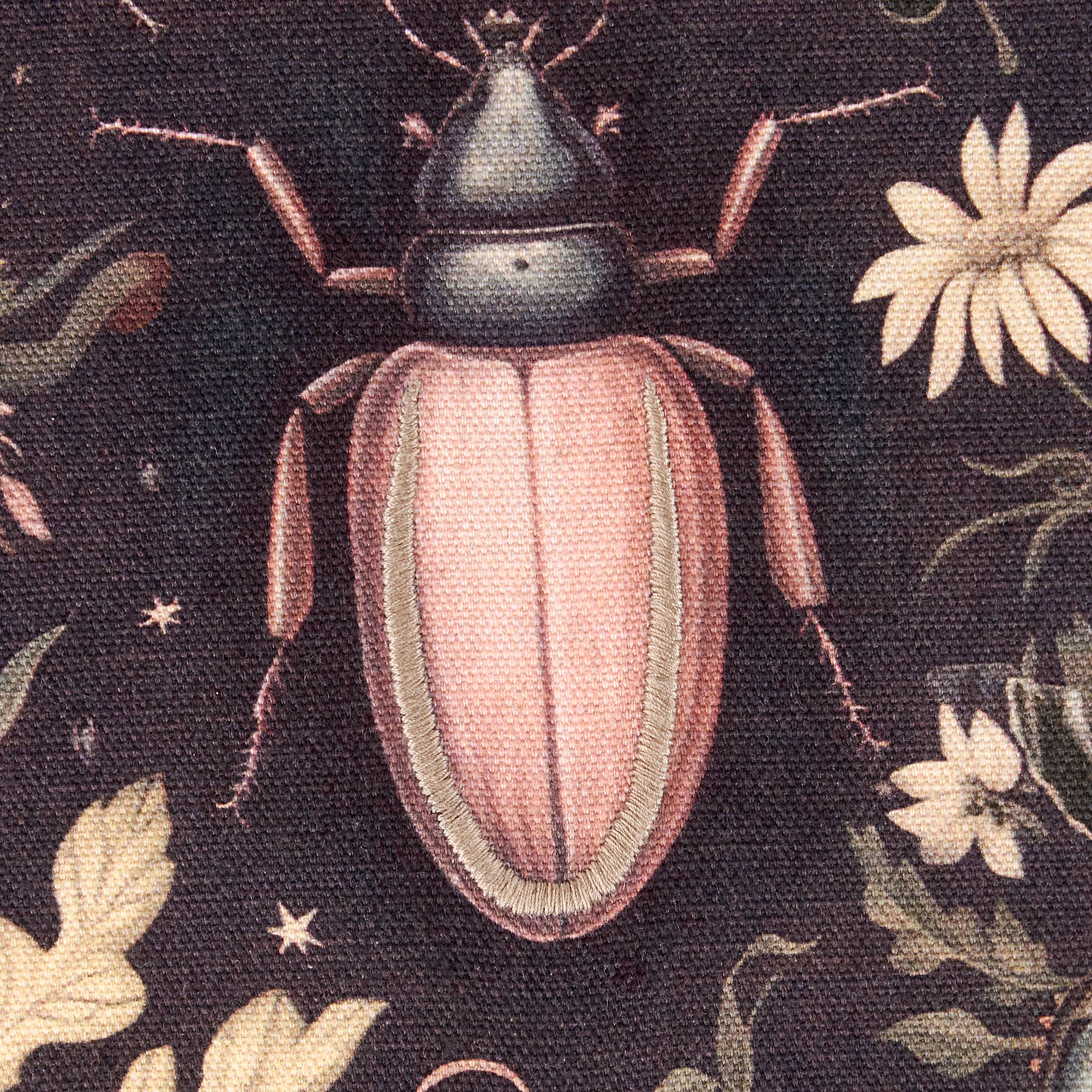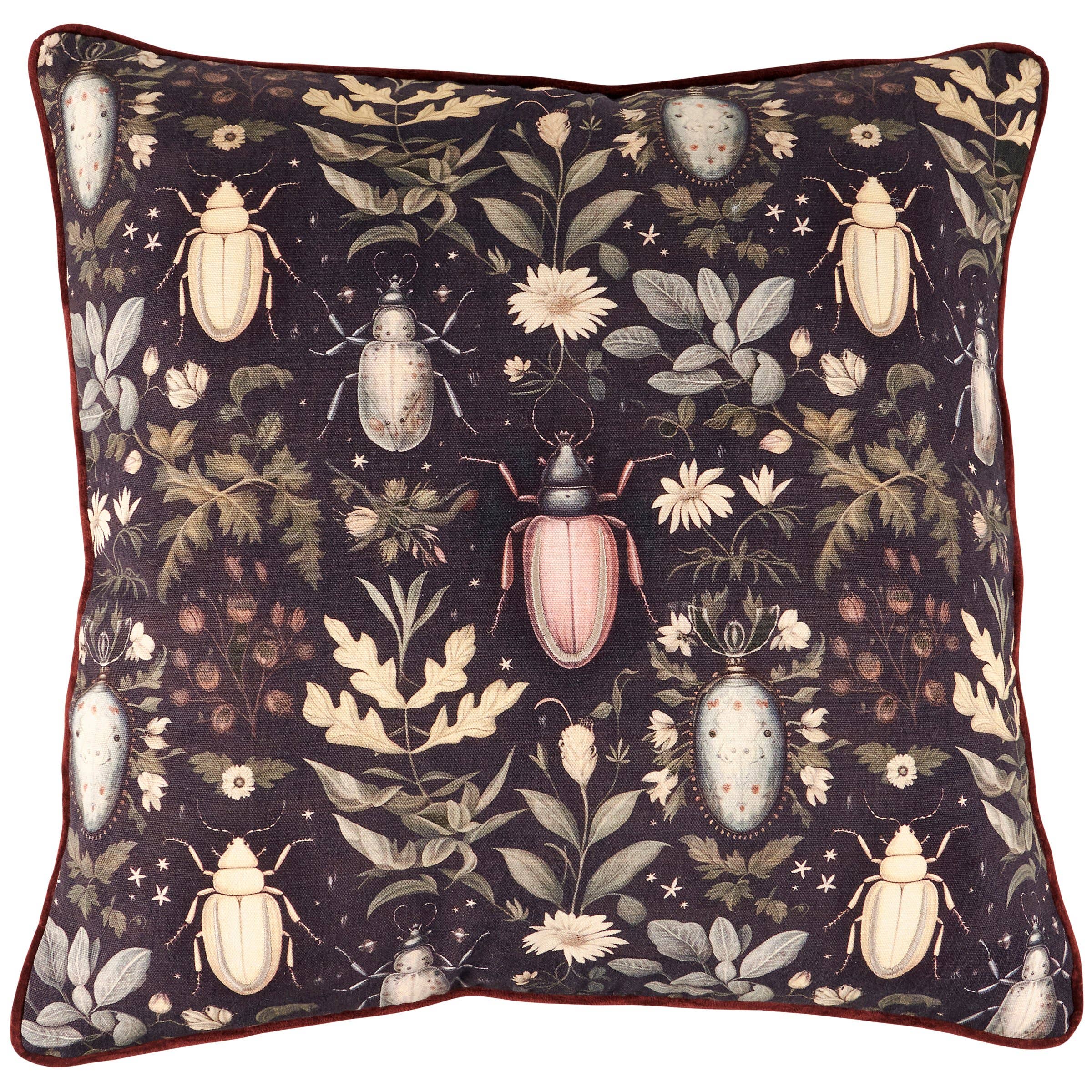 A decorative cotton pillow from our Moody Collection displaying a pattern of various beetles and flowers in a deep color palette. Pillow features coordinating maroon velvet on back with maroon piping trim. Our Beetles pillow includes a zipper to easily remove and clean machine-washable pillow cover. Contains polyester filling and is shipped vacuum-sealed for protection and storage. A stylish dark academia inspired home accent perfect for any room.