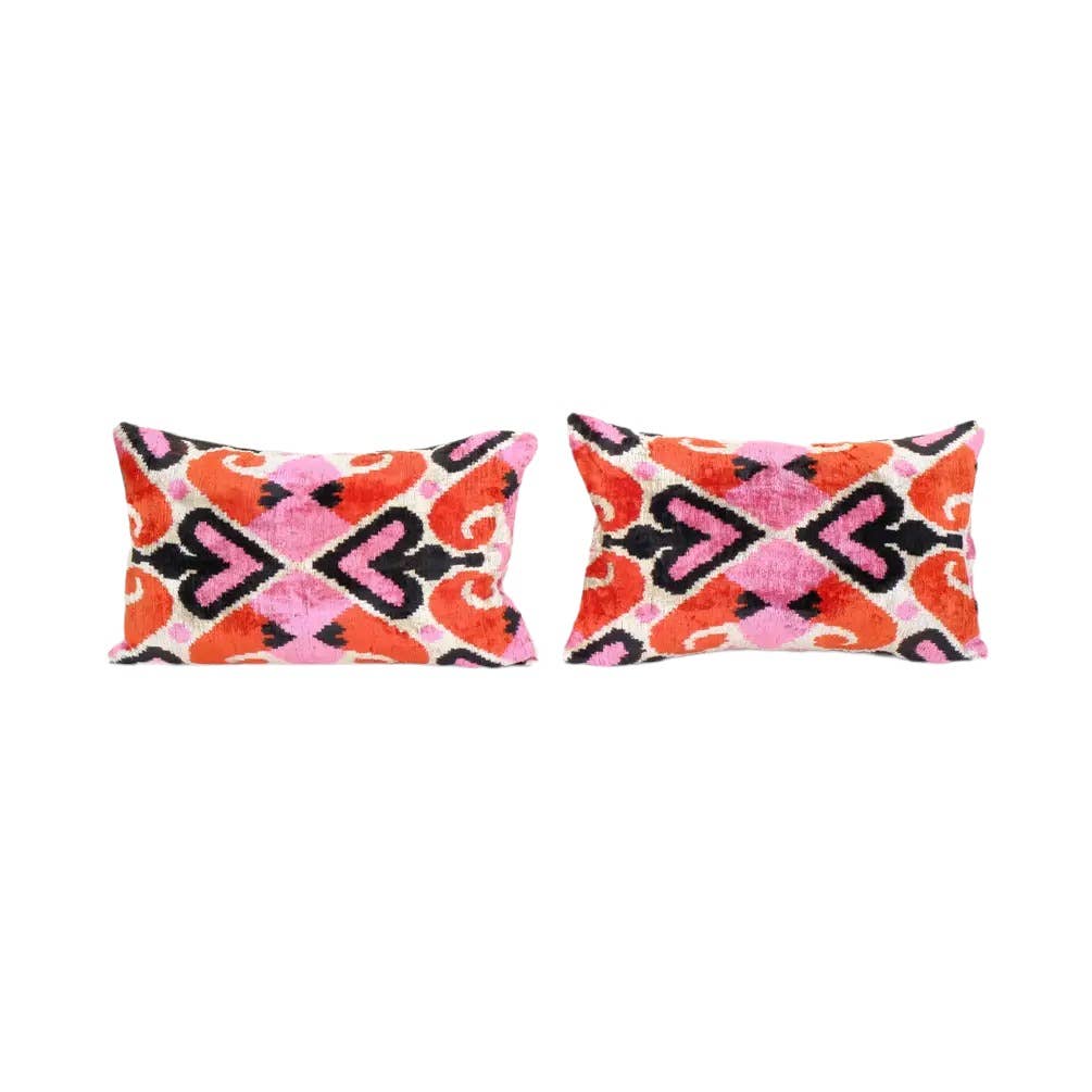 Pink Silk Ikat Velvet Pillow, Set of Two Colorful Velvet Lumbar Pillowcase, Pair Handmade Designer Throw Pillow from Uzbekistan