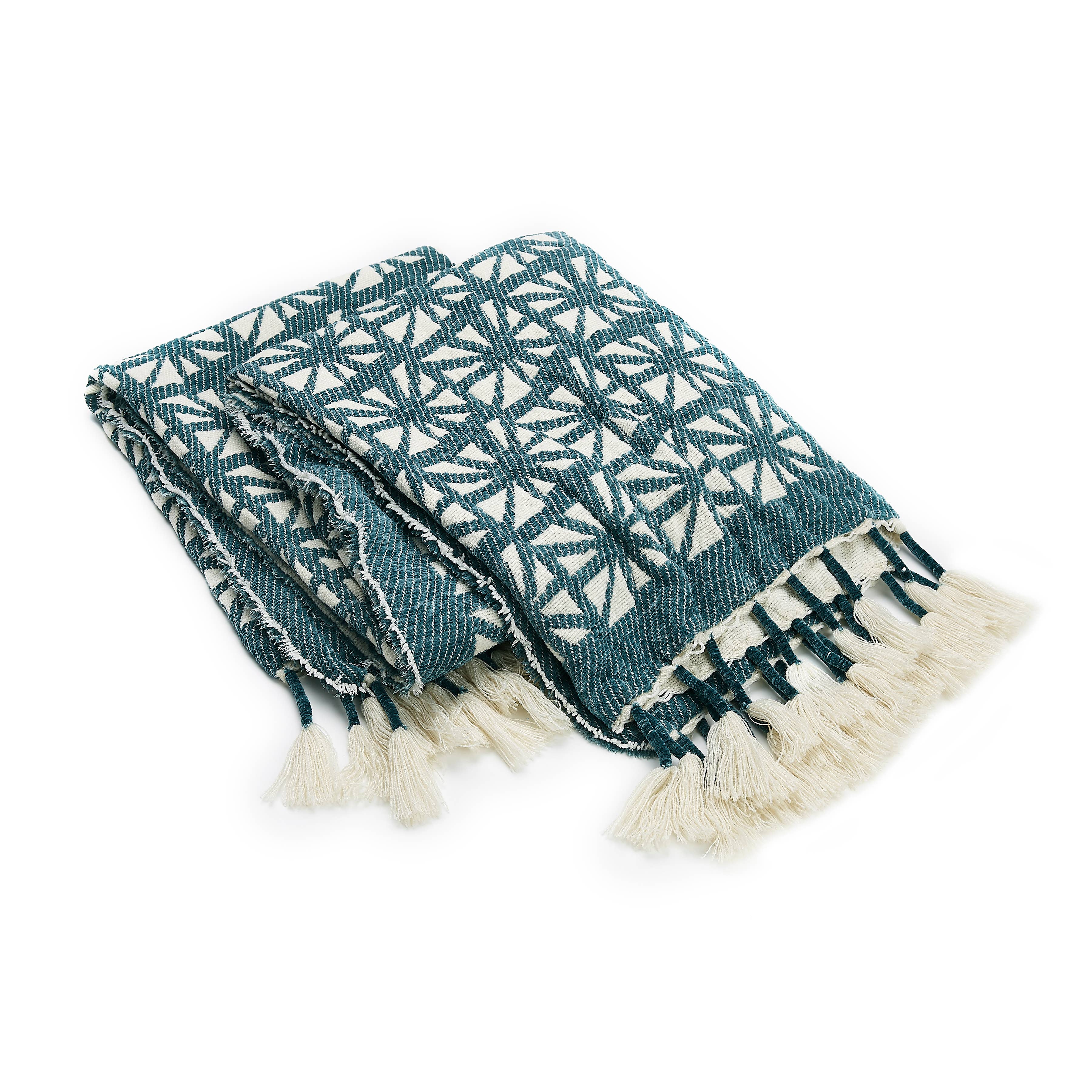 This cozy throw blanket features a pattern that celebrates the sun. In a soft greyish-blue and cream, this versatile and graphic blanket adds a pop of pattern to any space. Because details are everything, we've added some fun tassels to give the blanket some movement and a touch of boho.