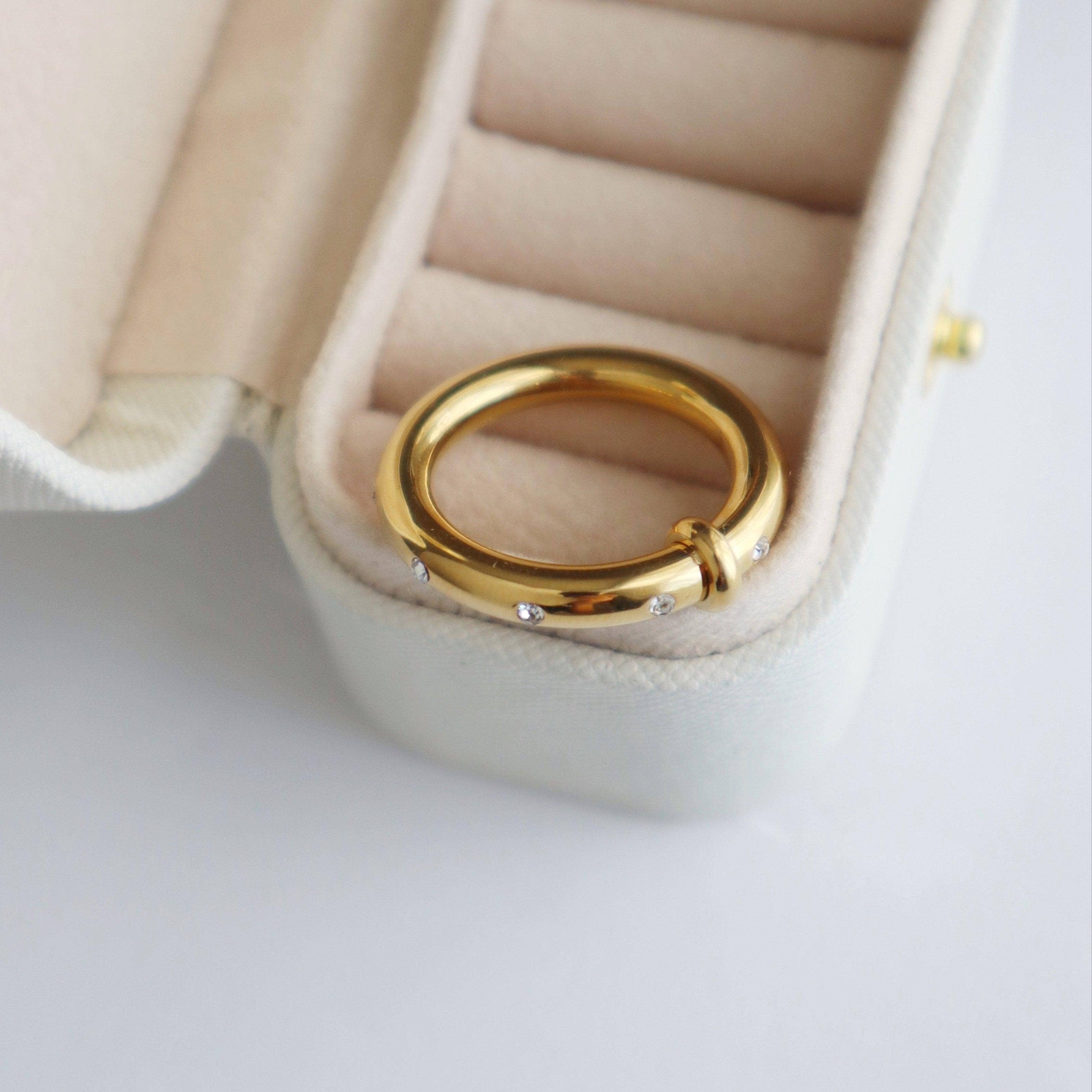 Introducing the Ana Ring, with CZ stones circling the exterior of the ring, it makes a stylish choice for any occasion. -stainless steel, gold plated