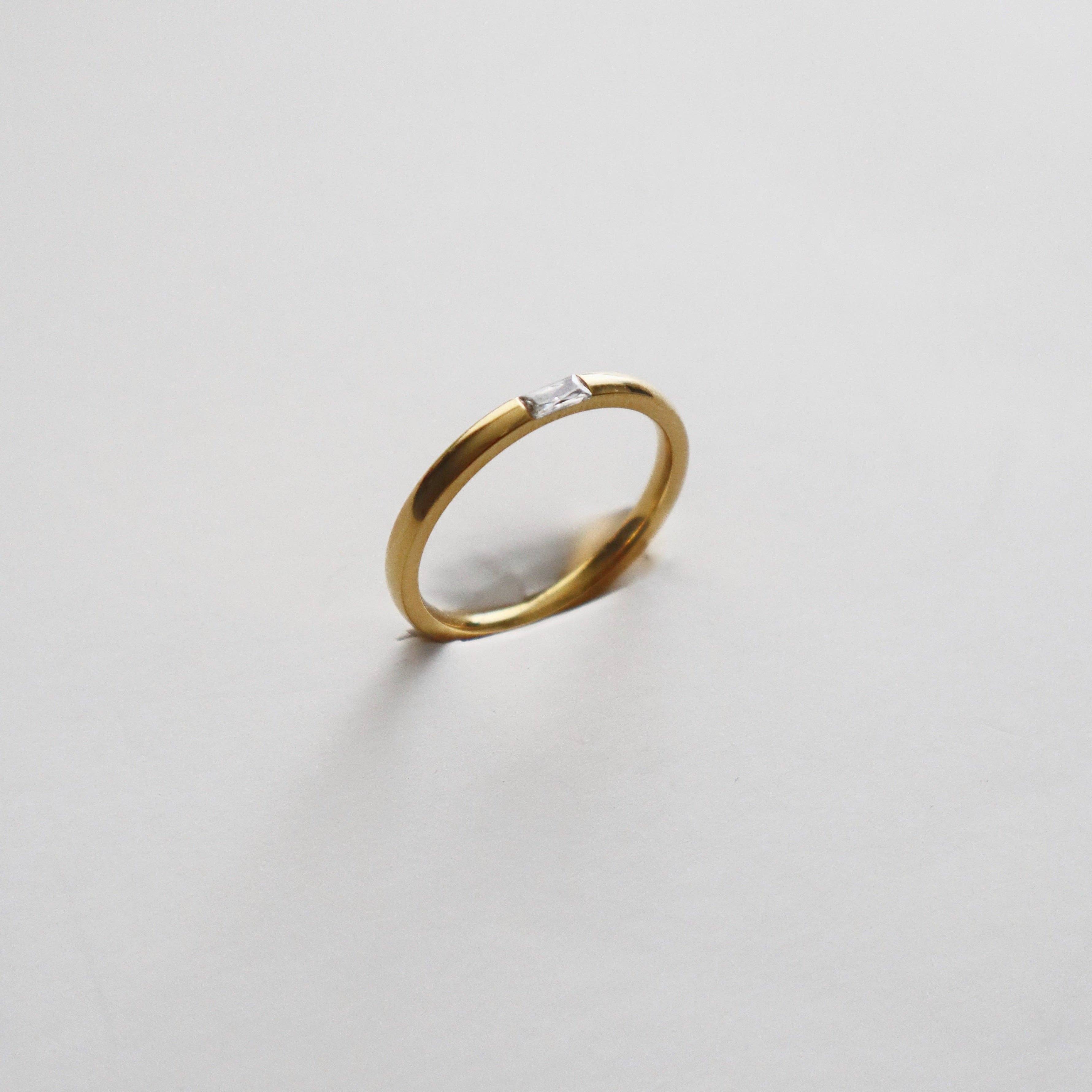 Its effortless charm and comfort make it the perfect accessory for any occasion. The single rectangular zirconia stone is subtle, perfect for adding a little sparkle to any look. Perfect for everyday wear. -stainless steel, gold plated