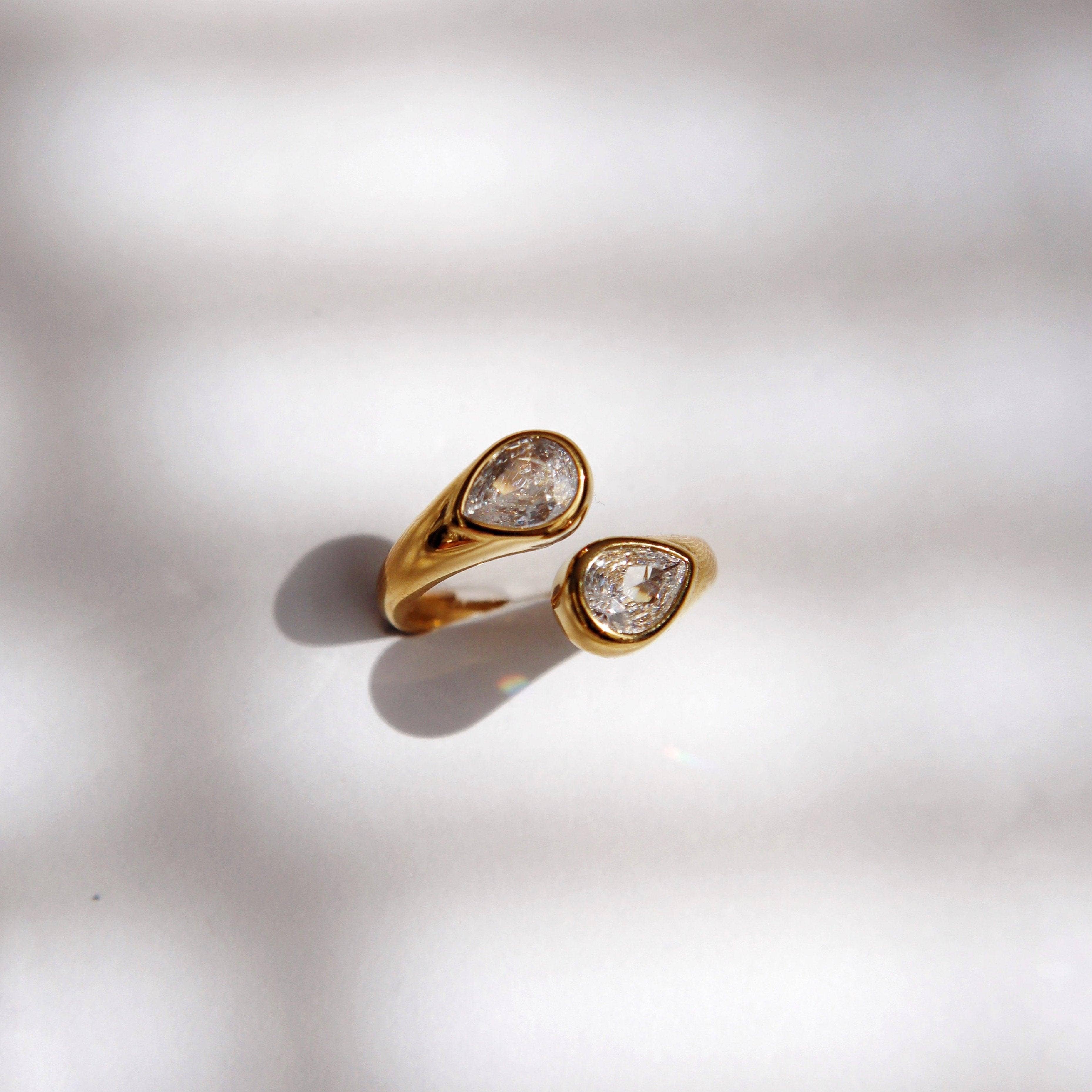 This elegant ring features two dazzling cubic zirconia stones at each end adding double the sparkle. The Sloane Wrap Ring is adjustable, ensuring a perfect fit for anyone. -stainless steel, gold plated