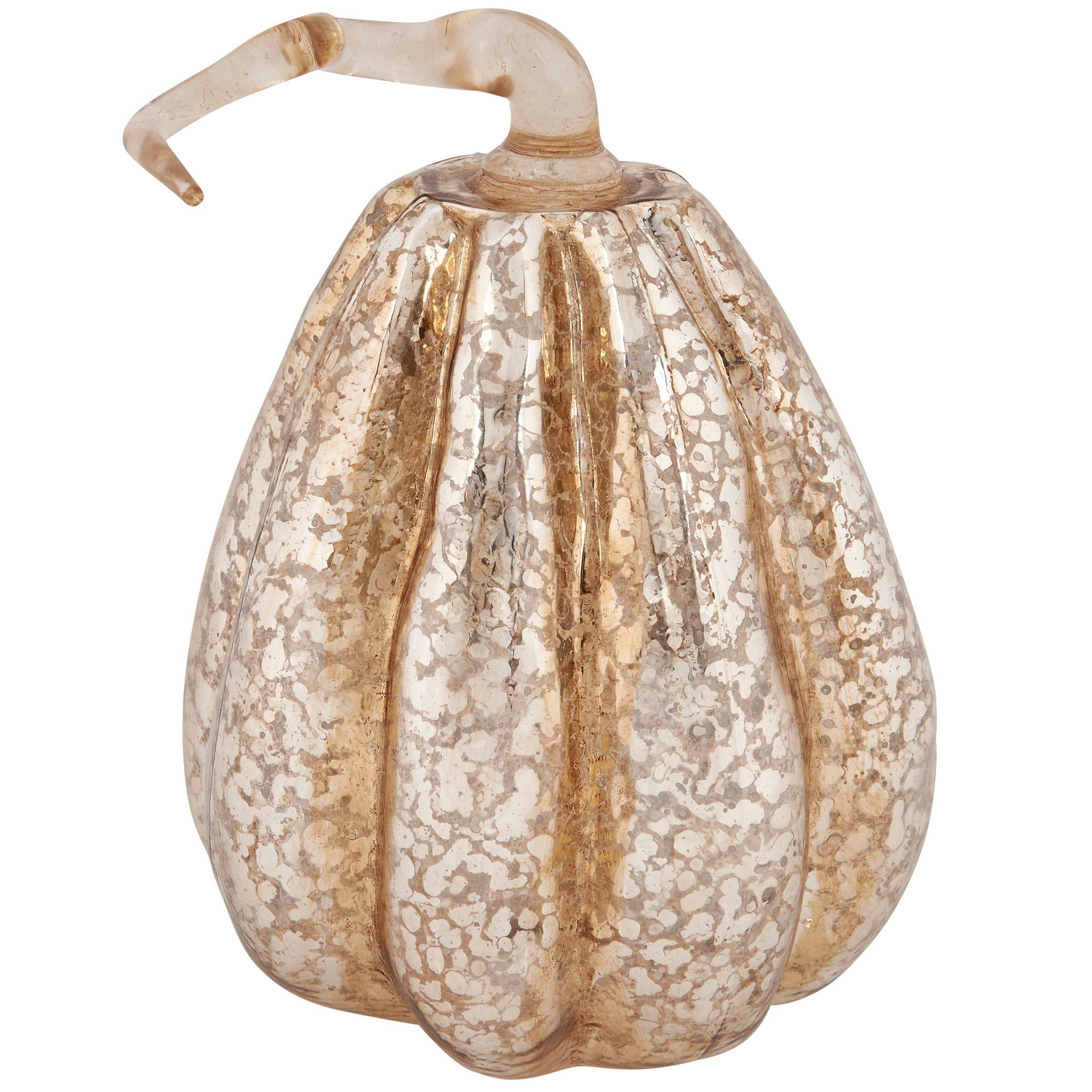 A decorative glass pumpkin from our Fall & Harvest Collection featuring a tall shape and mercury glass inspired finish with coiled glass stem for added interest. Our tall Mercury glass pumpkin is designed to free-stand on any flat surface. Place in a display to add a stylish touch of autumn or with other decorative pumpkins as a collection. A chic home accent with a variety of seasonal display options.