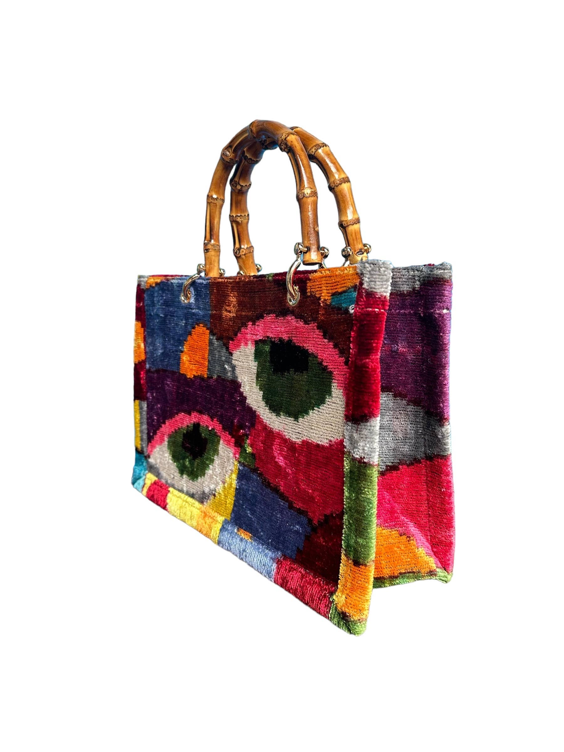 Silk Velvet Ikat Small Tote Bag with Bamboo Handle