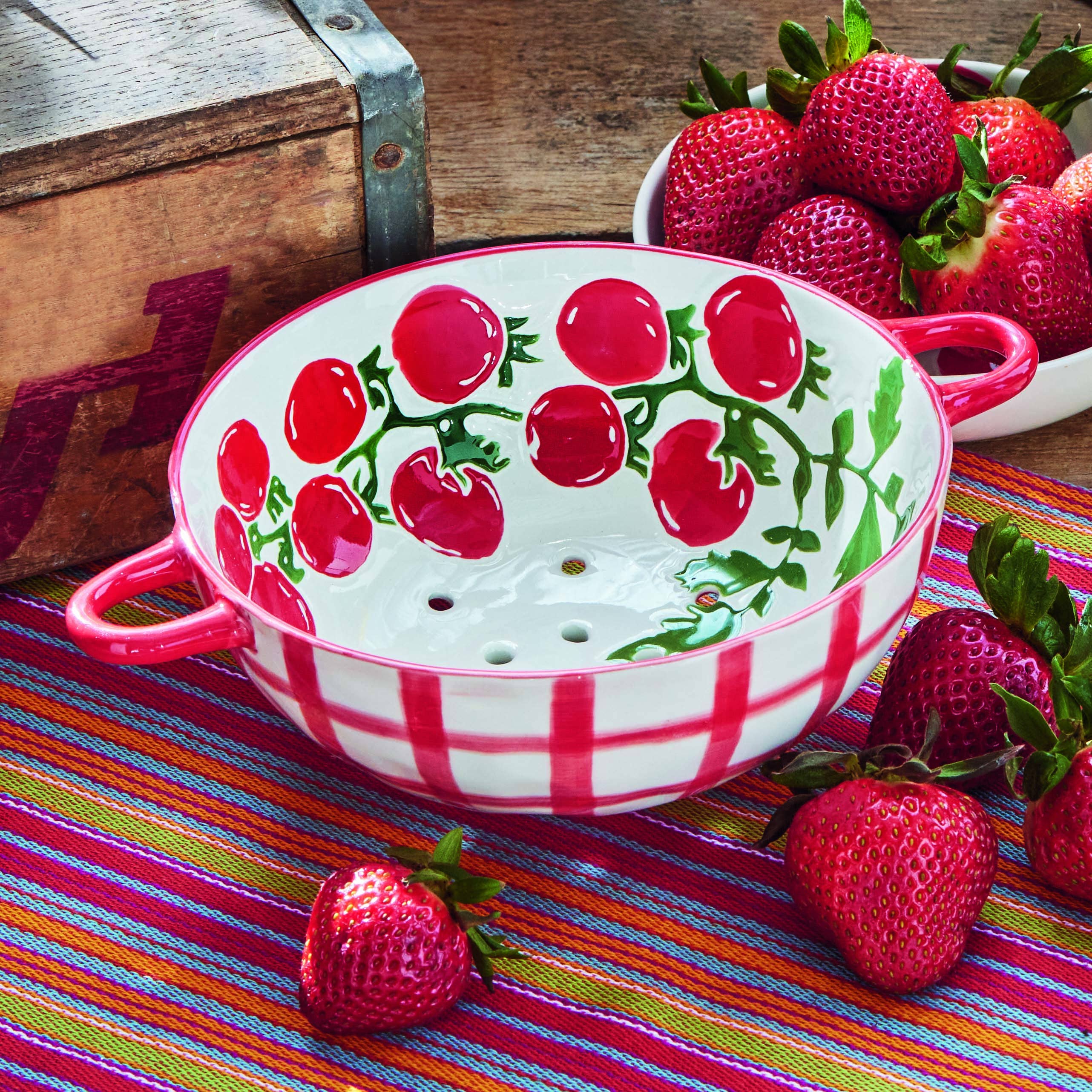 strain your berries and tomatoes with a touch of garden charm! this stoneware berry strainer features a hand-painted and hand-stamped tomato design, perfect for rinsing and separating your harvest.